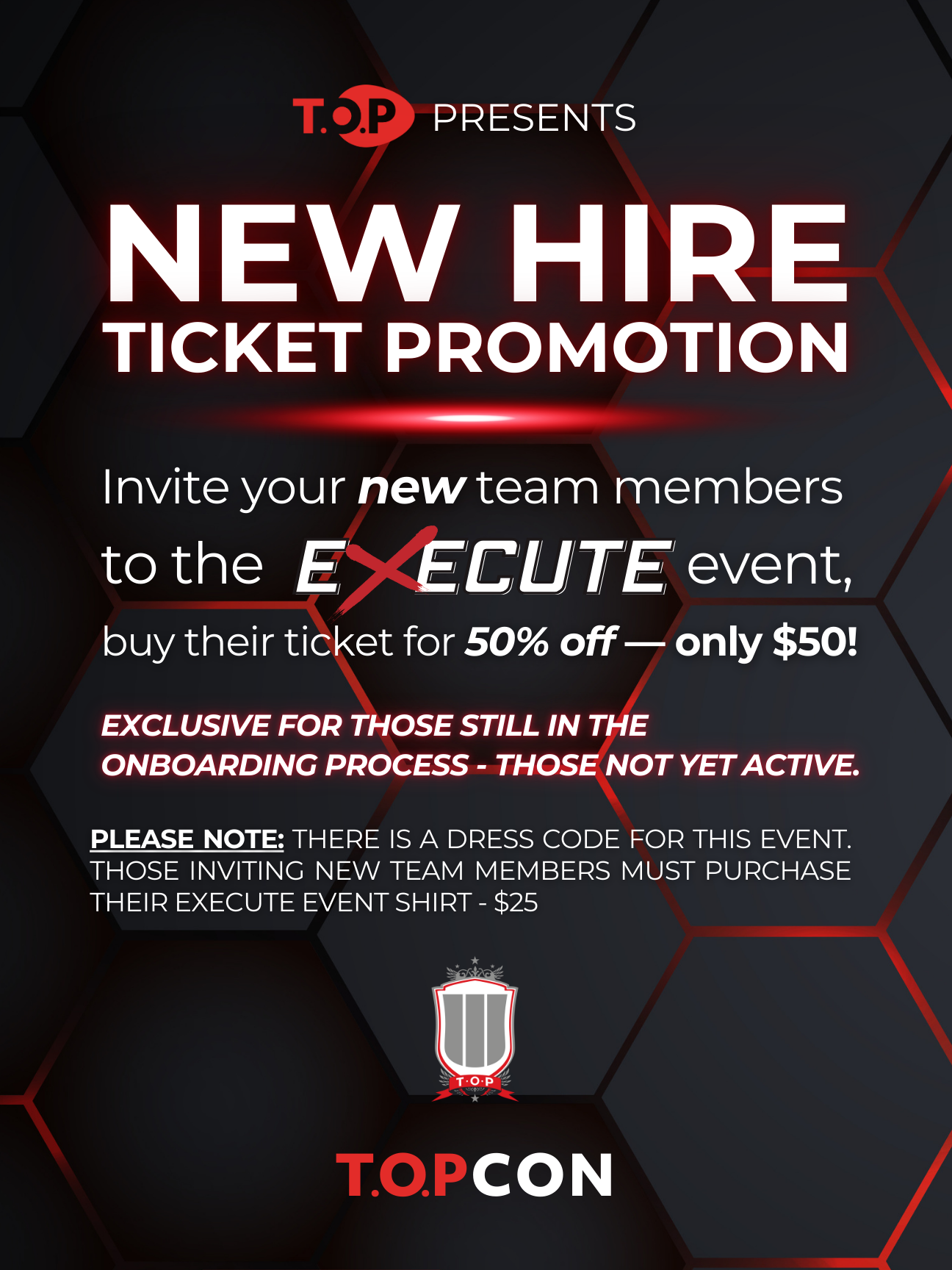 Please Note: there is a dress code for this event. Those inviting new team members must purchase their Execute Event Shirt - $25 (NOT INCLUDED IN TICKET PRICE)